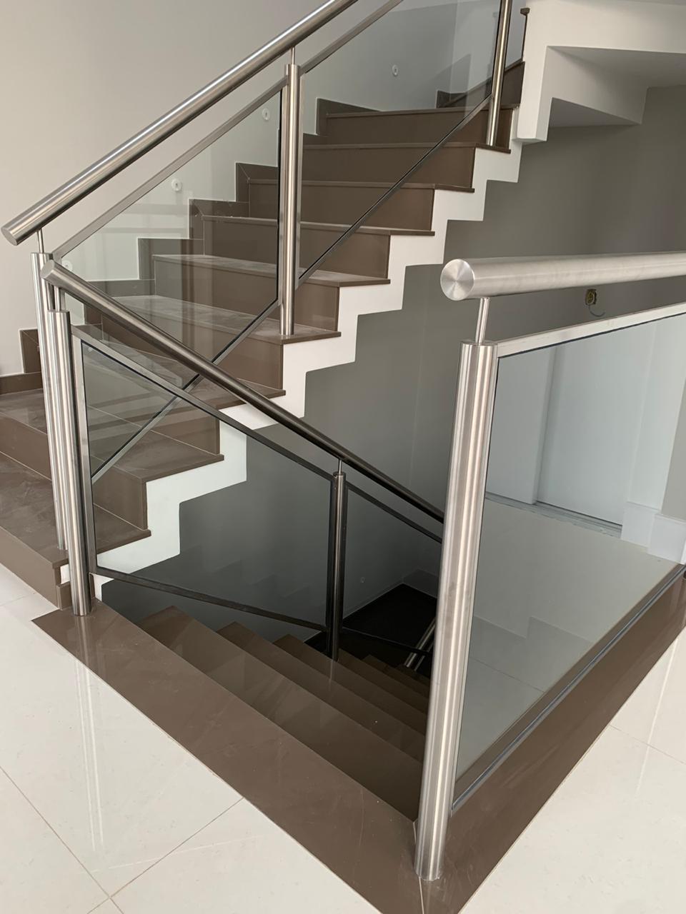 Estruturas de corrimão com fechamento lateral em vidro no caso de torres com grapas e vidro temperado, temperado laminado ou especial, temperado quando situações autoportantes. Comumente as torres e passa mão são em inox 304, na bitola de 1 1/2″. Disponíveis nos acabamentos inox polido e escovado. Executado conforme a obra e projeto, sendo que a Metametais tem todos os recursos necessários para fornecer o vidro conforme a necessidade do cliente.